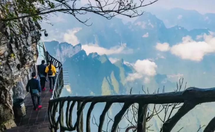 Take a walk along Tianmen Mountain's thrilling Cliff-Hanging Walkway. Stretching over the cliffs, it provides uninterrupted views of Zhangjiajie’s towering deep valleys and dense forests.