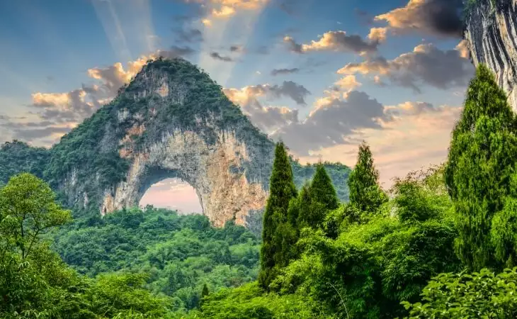 Ascend to the summit of Moon Hill, one of the Li River valley's unique karst rock formations, from where you'll get spectacular views over the lush paddy fields and limestone towers for which the area is famous.