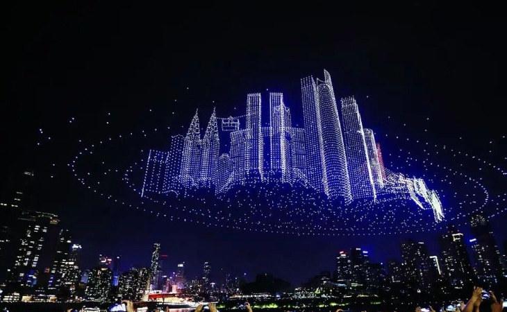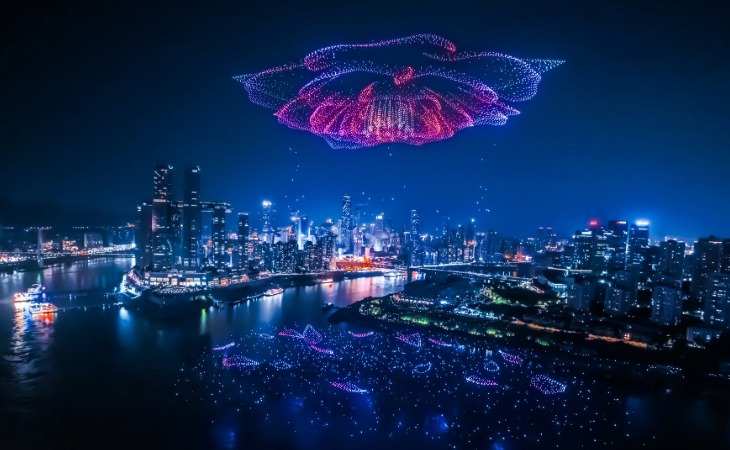 Watch Chongqing's skyline come to life in a magical light show, where over 5,000 synchronised drones choreograph a stunning performance above the city's soaring riverside towers.