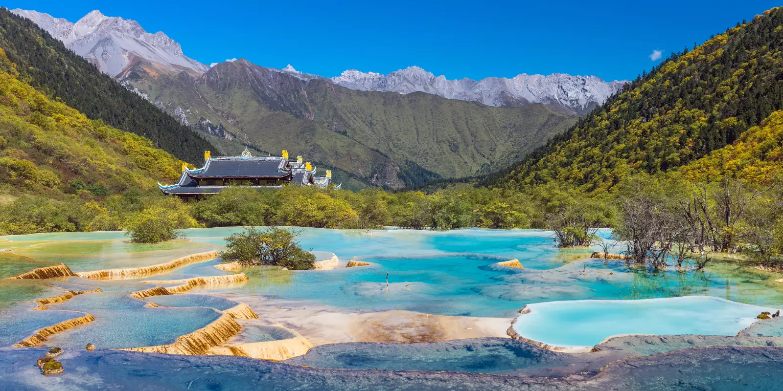 Uncover the beauty of the Huanglong Pools and Nine Villages Valley (Jiuzhaigou) from ragged peaks and saphire lakes to abundant forests and rushing waterfalls