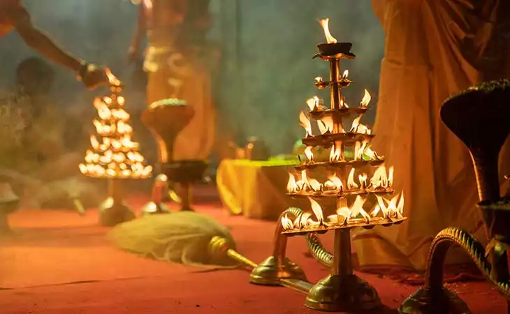 The Aarti ceremony is a traditional Hindu ritual involving the worship of deities through the use of light, typically in the form of lamps or candles. In Madurai, the Meenakshi Amman Temple is known for its grand and spiritually significant Aarti ceremonies.