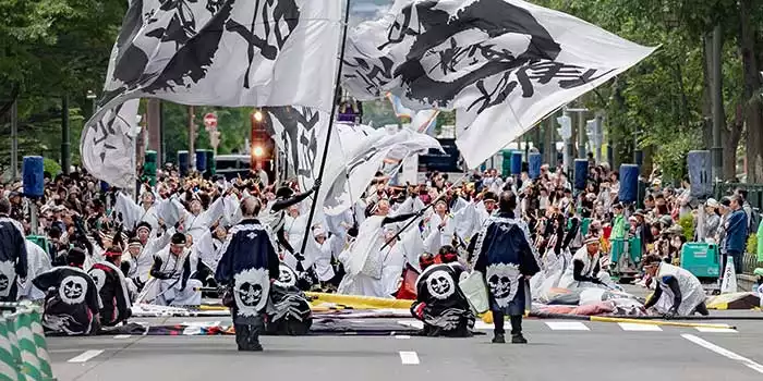 The festivities crank up in the fine weather in the city of Sapporo on Hokkaido Island. In June you have the Yosakoi Soran, with energetic, joyful and colourful dance procession on the streets surrounding the central Odori Park. The many dancers are performing a modern take on a traditional dance of the summer.
