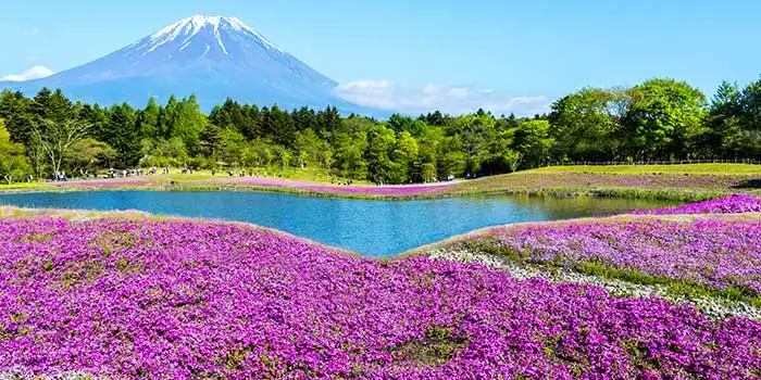 At the foot of Mt Fuji, in the Fuji Five Lakes area, the Fuji Shibazakura Festival is the most scenic place to admire the pink moss phlox in full bloom.