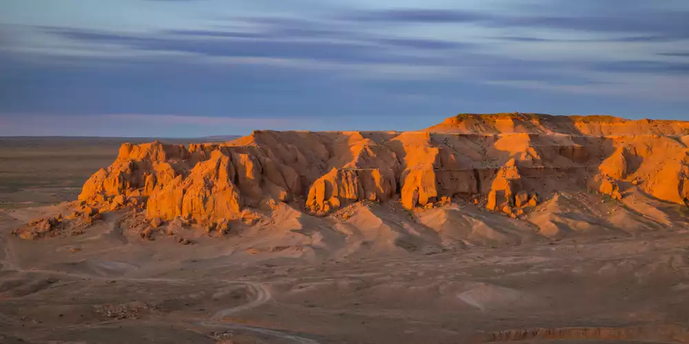 Known as the Flaming Cliffs, due to the clay soil glowing red at sunset, Bayanzag means "rich in saxaul shrubs", named for a thorny bush measuring approximately two metres high, found among the sand, rock, and open plains of the surrounding Gobi Desert.