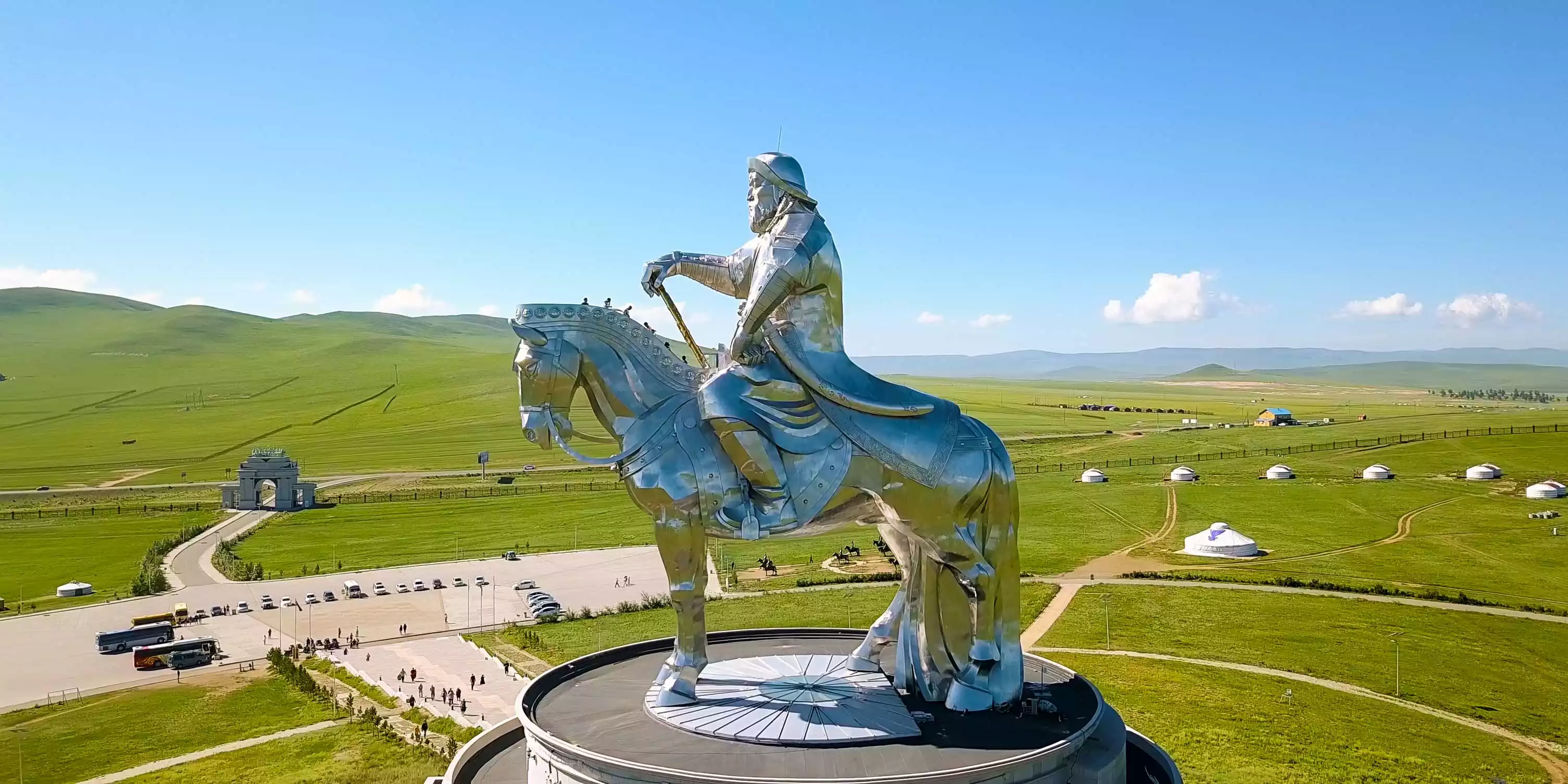 The statue faces to the East, as if Genghis Khan was returning home, and if you look to the East you could see the small statue of his mother welcoming him home.