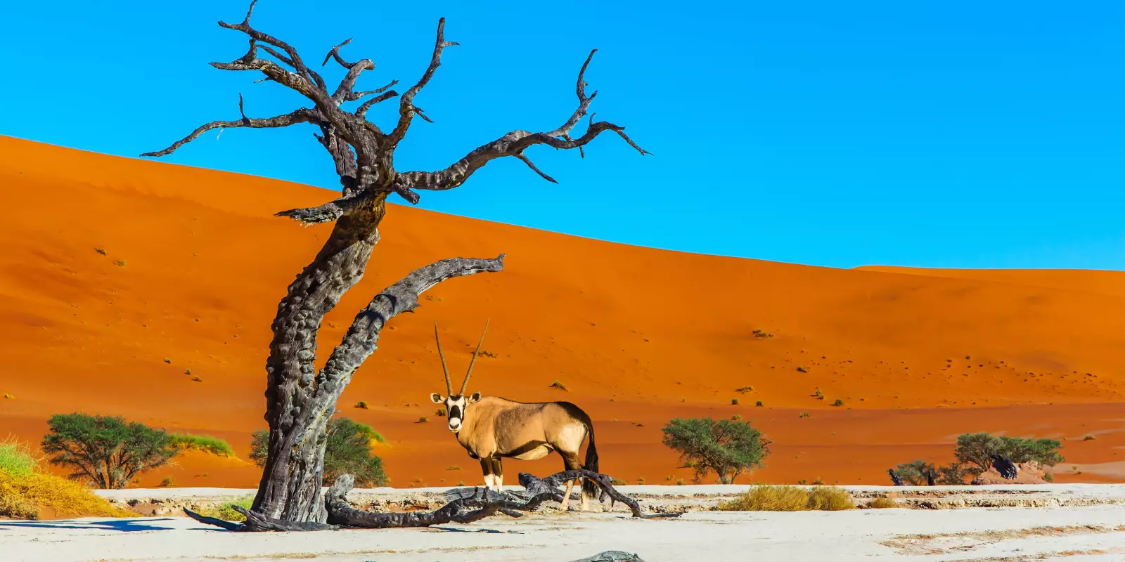 Discover the hidden corners and delicate detail of the desert as you explore the Namib-Naukluft Park. Arriving at sunrise, discover Sossusvlei, the stark, salt-clay pan at its heart, nestled among orange dunes and stand before the towering Dune 45. Pause for a well-deserved picnic lunch at the starkly beautiful Deadvlei then walk through Sesriem Canyon. At thirty metres deep and only two metres wide at points, it was carved by the Tsauchab River – follow the pathway upstream to find the lovely pool, inviting you in for a swim.