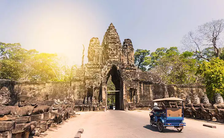 What better way to see the world famous Angkor temple complex than from the back of a traditional tuk tuk? You'll explore Angkor Wat, the centrepiece of Siem Reap's famous temples, before riding your tuk tuk to Angkor Thom and the Bayon Temple, a 12th-century masterpiece. Lastly, buried deep in the jungle, you will find Ta Prohm; a photogenic and atmospheric array of trees wound through temple ruins.